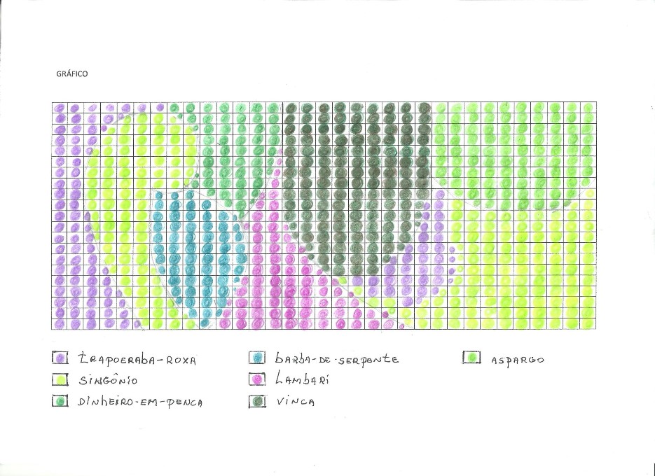 A quantidade de espécies necessárias é proporcional ao número de vasos/bolsas ou outro recipiente escolhido. Se a parede vai receber 150 recipientes, então, vamos precisar de 150 mudas. Um gráfico é o melhor aliado na hora de determinar o desenho. Gosto de usar uma folha quadriculada e ir preenchendo os espaços de acordo com o desenho que imaginei, brincando com espécies de formas e cores diferentes.