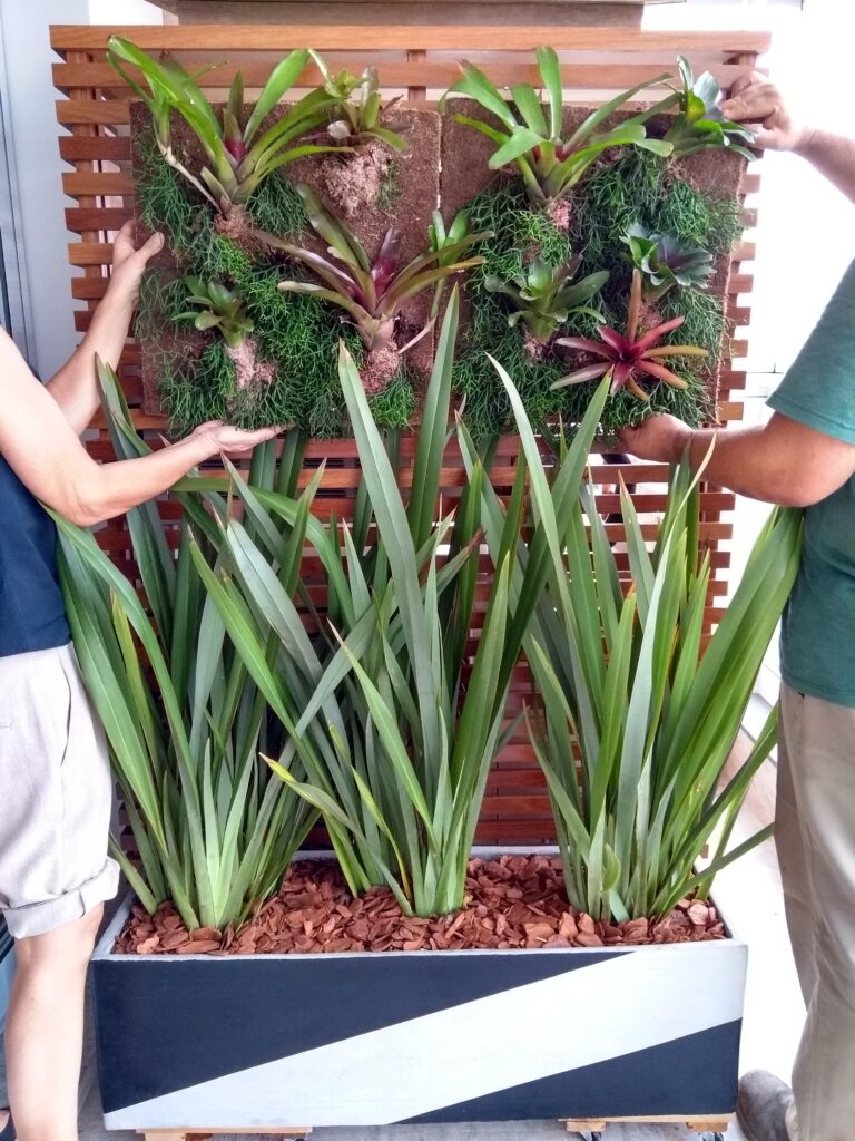 - Estrutura: Impermeabilização da parede, suportes (módulos, painéis, etc.) com instalação, vasos (se necessário), material drenante, substrato e fertilizantes.