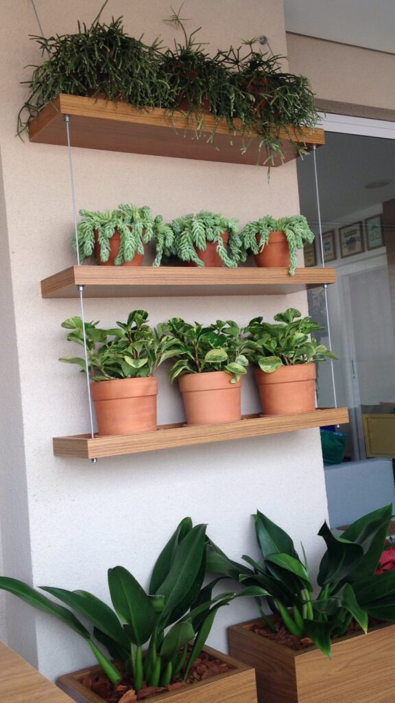 - Prateleiras: Econômicas e versáteis, as prateleiras são multifuncionais e podem otimizar espaços com variados tipos de plantas em vasos;
